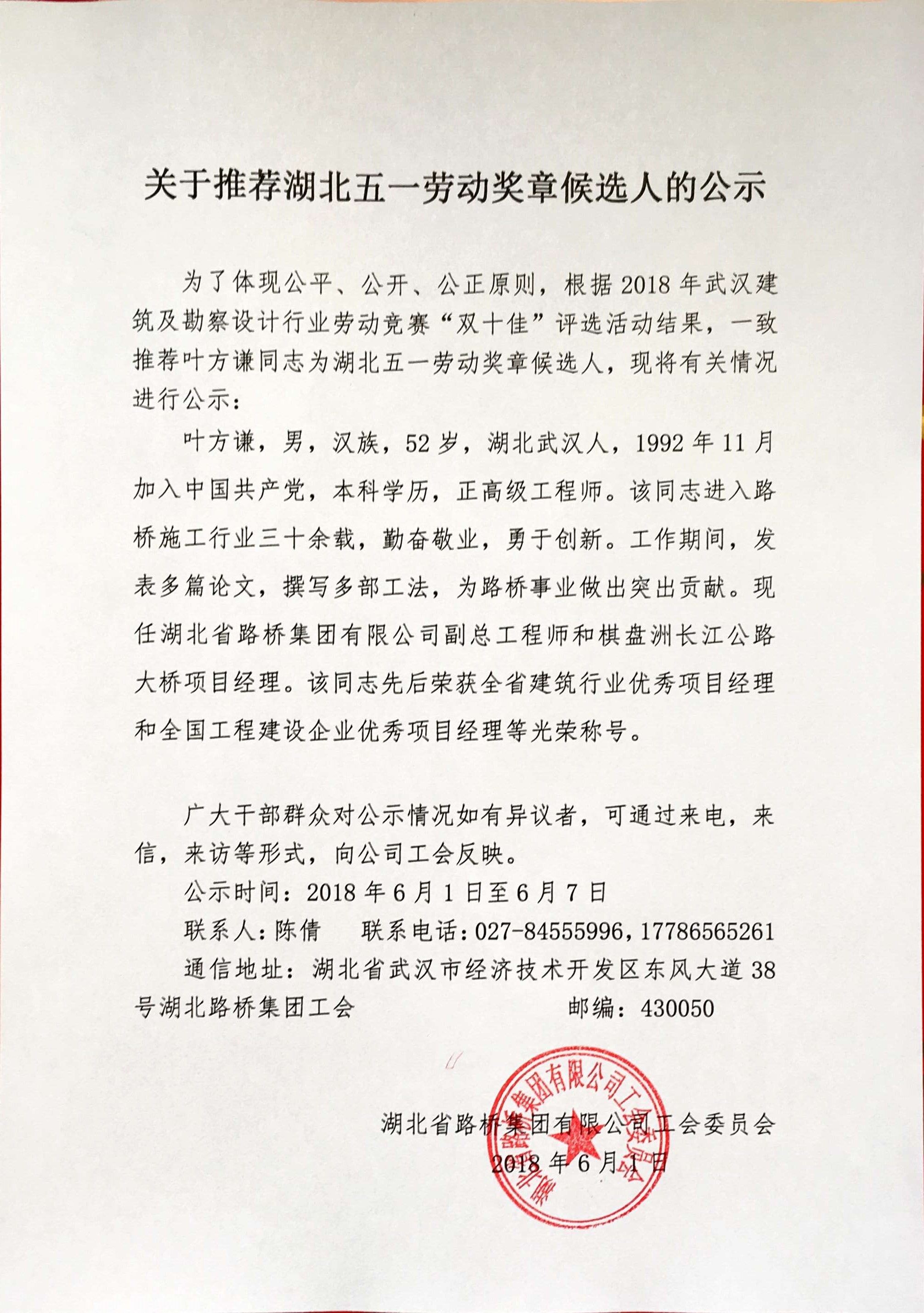 關(guān)于推薦湖北五一勞動獎?wù)潞蜻x人的公示