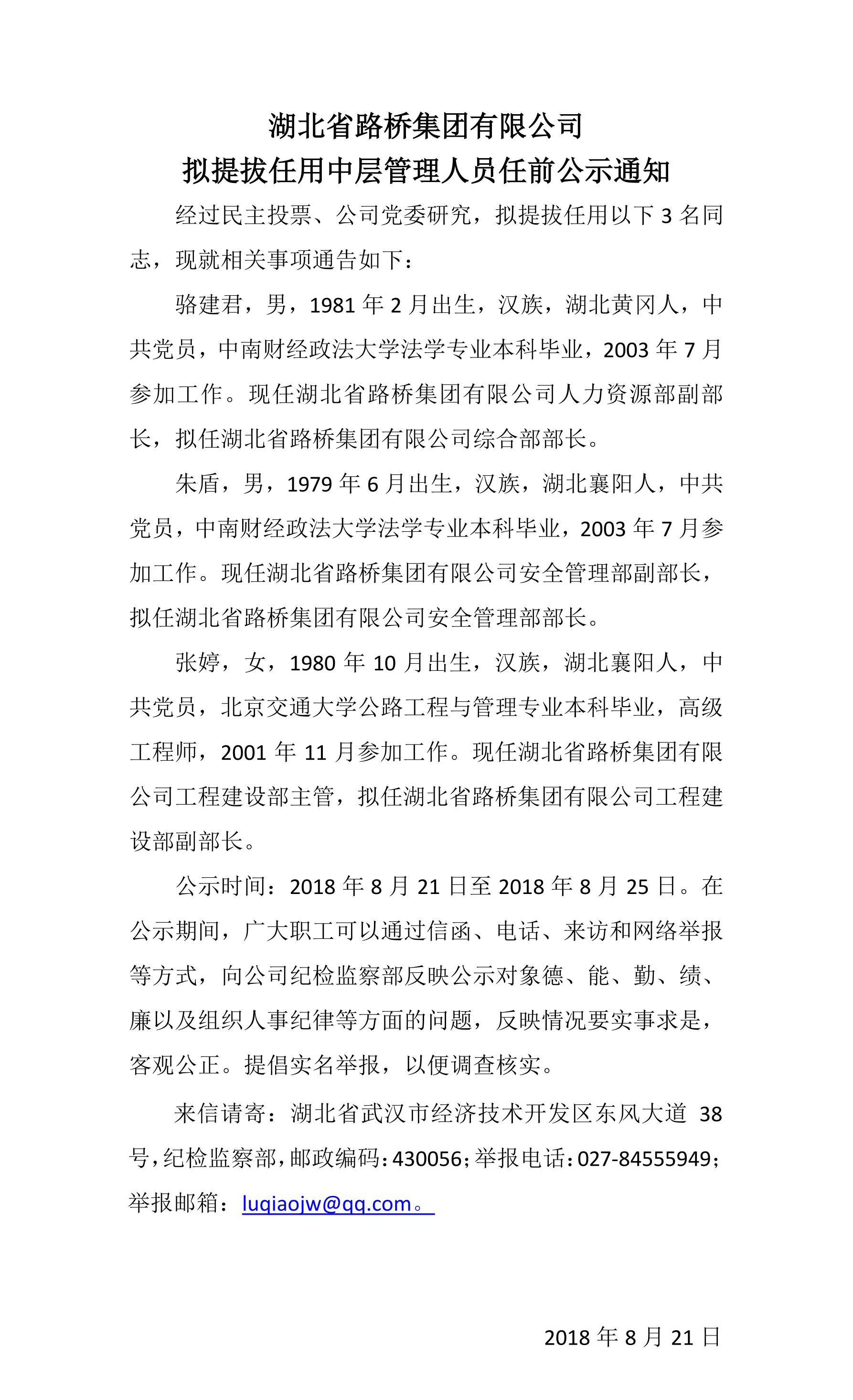 2018年湖北省路橋集團有限公司擬提拔任用中層管理人員任前公示通知