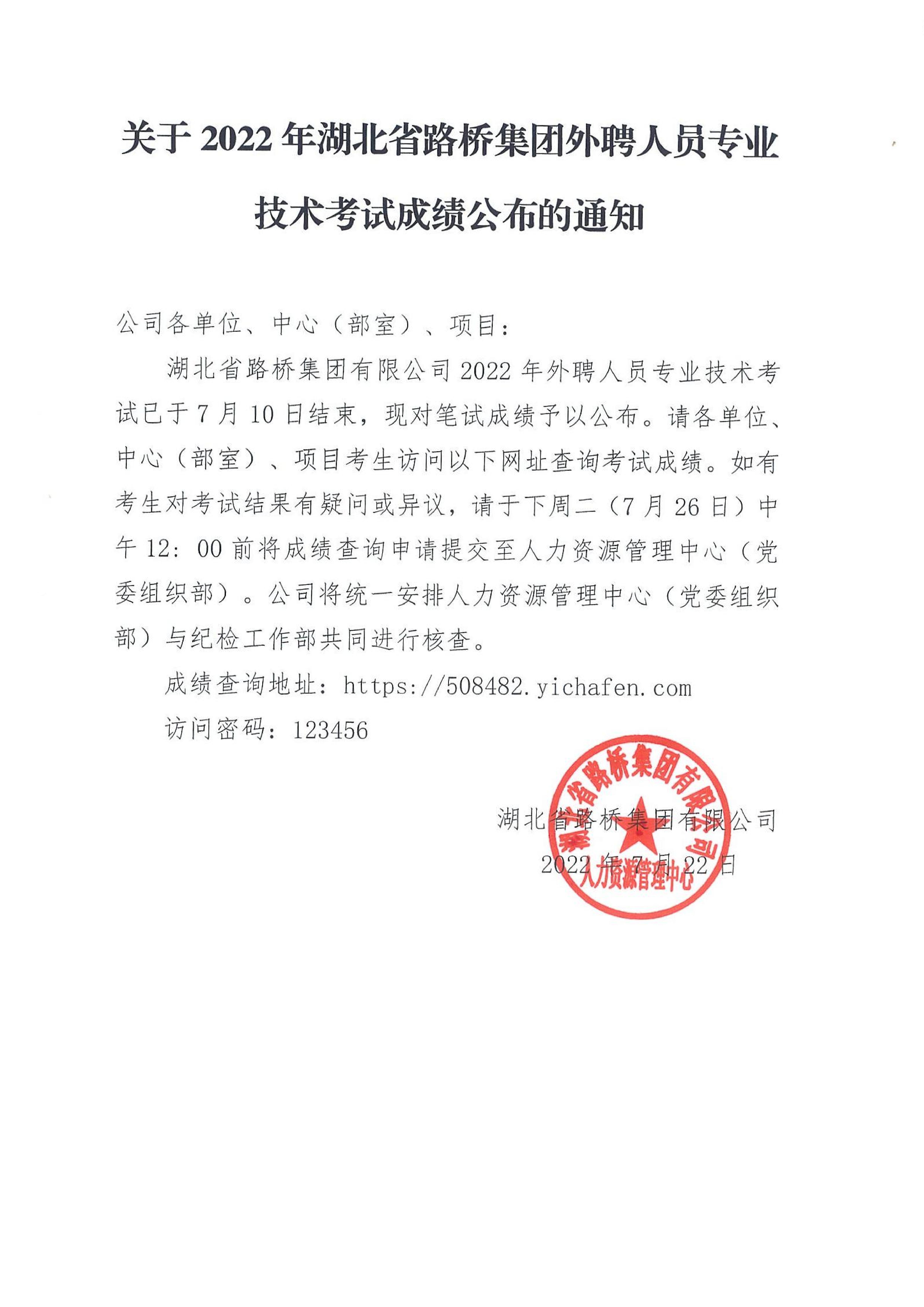 關(guān)于2022年湖北省路橋集團外聘人員專業(yè)技術(shù)考試成績公布的通知